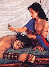 1. One thing I noticed the last and only time I saw the film as an adult is that the extras and bit players are all old, whereas the leading players are not. Even the soldiers are old. There's a strange dialectic and a divide between the two elements of the movie as if there are two movies. One, the kinky part, with the stars, which accounted for its success; and the other filled with the elderly background players, who by their very presence suggest that whatever happened in the Bible happened a long, long time ago. It is, after all, a story from the Old Testament. Even the soldiers are old. Cecil B. DeMille, like John Ford, loyally offered employment to silent movie actors who had seen better days, long after they were forgotten.